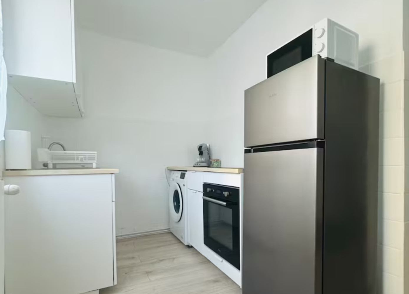 La cuisine est entièrement équipée : four, plaques de cuisson, machine à laver, réfrigérateur avec congélateur, machine à café, grille-pain, bouilloire ainsi que tout le nécessaire de base pour cuisiner.